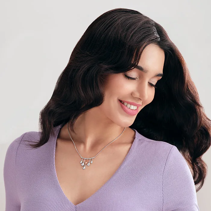Like a mesmerizing dance, this platinum necklace showcases a cluster of free flowing drop-shaped motifs studded with diamonds. These free flowing raindrops symbolize the hope and optimism with which you look at life, embracing each aspect of what it offers you with open arms. Crafted in 95% pure platinum, found in limited quantities and in select locations across the world, this is a precious metal that’s undeniably rare.